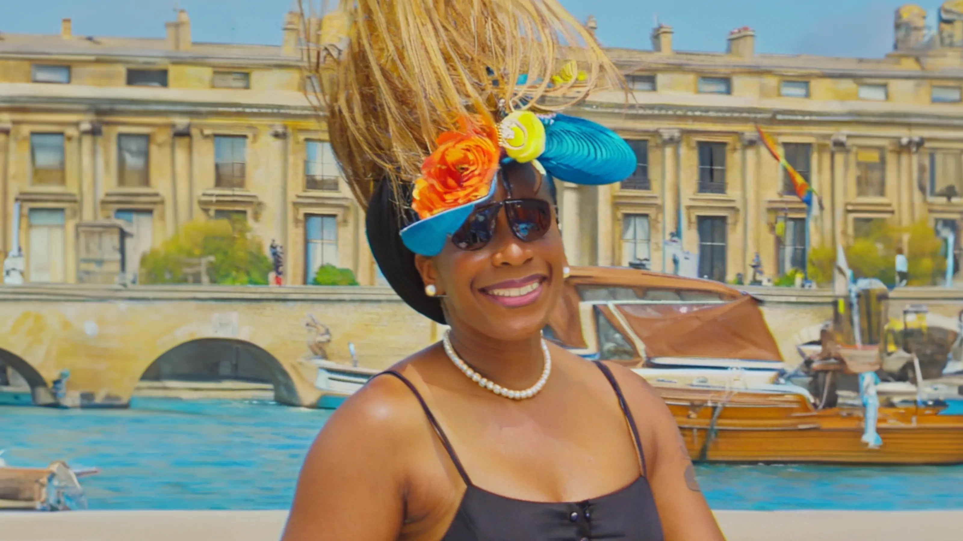 This is Saderia, a past Black & Abroad guest. We asked AI to imagine her in Paris, France. The AI model generated images with items like flowers and headdresses in her hair.